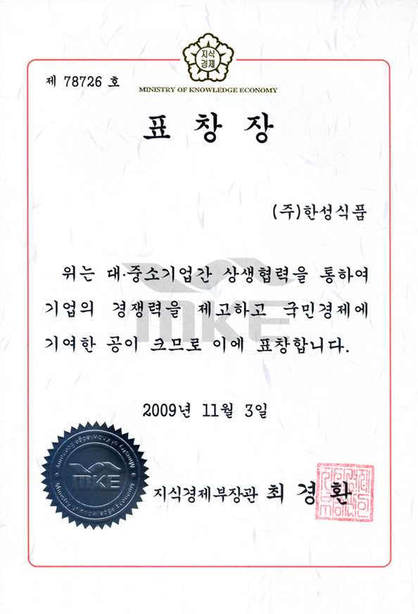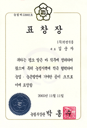 Commendation by Minister of Food, Agriculture, Forestry and Fisheries