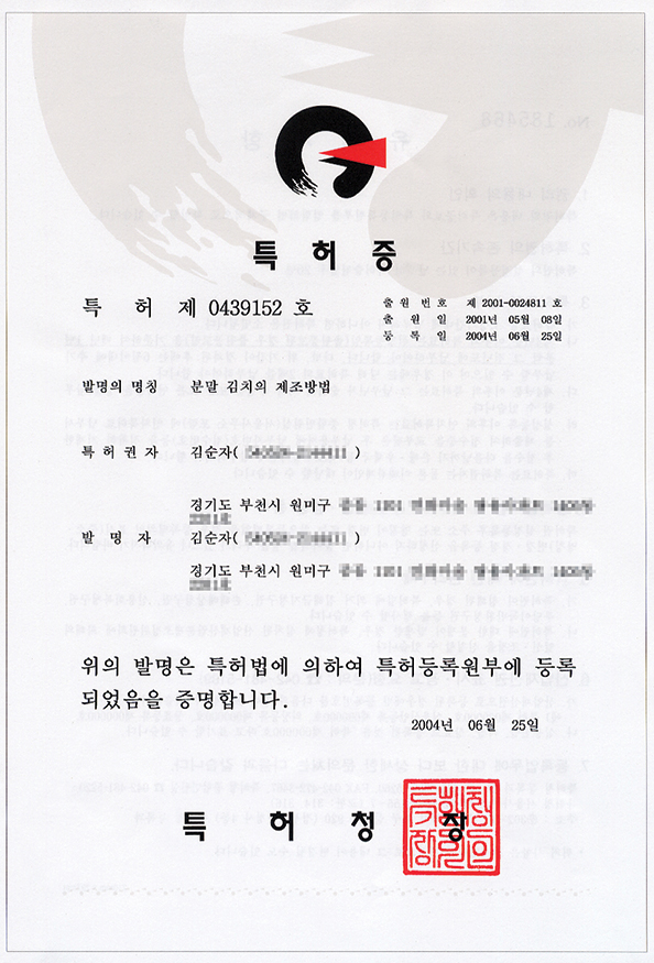 | 13 | 2004. 06. 25 | 0439152 | 분말김치 제조방법 |