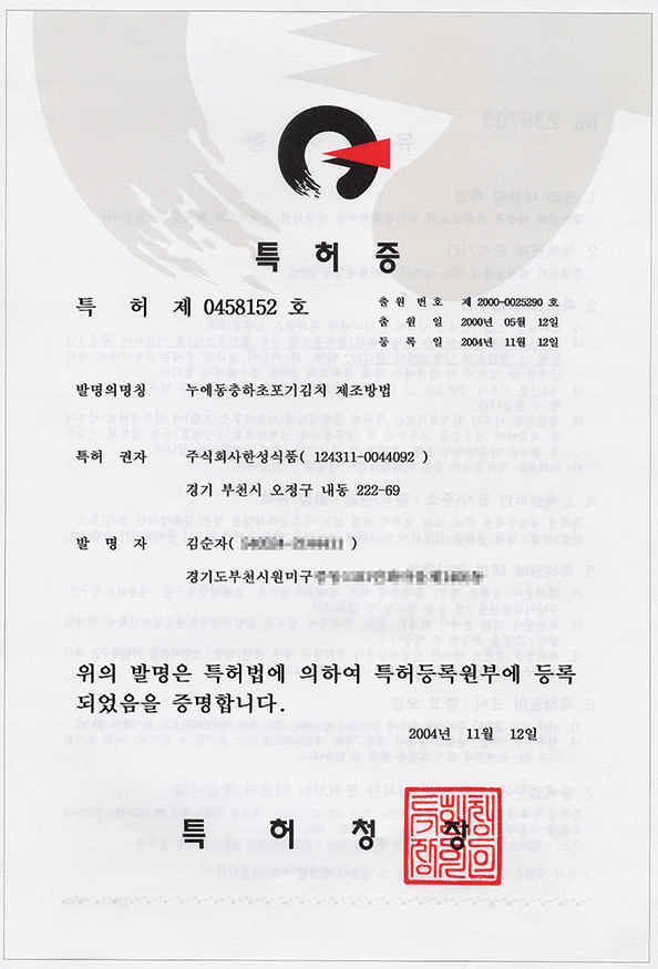 | 12 | 2004. 06. 25 | 0439151 | 동결건조김치 제조방법 |