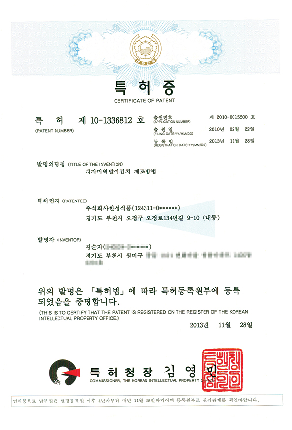 | 21 | 2013. 11. 28 | 10-1336812 | 치자미역김치 제조방법 |