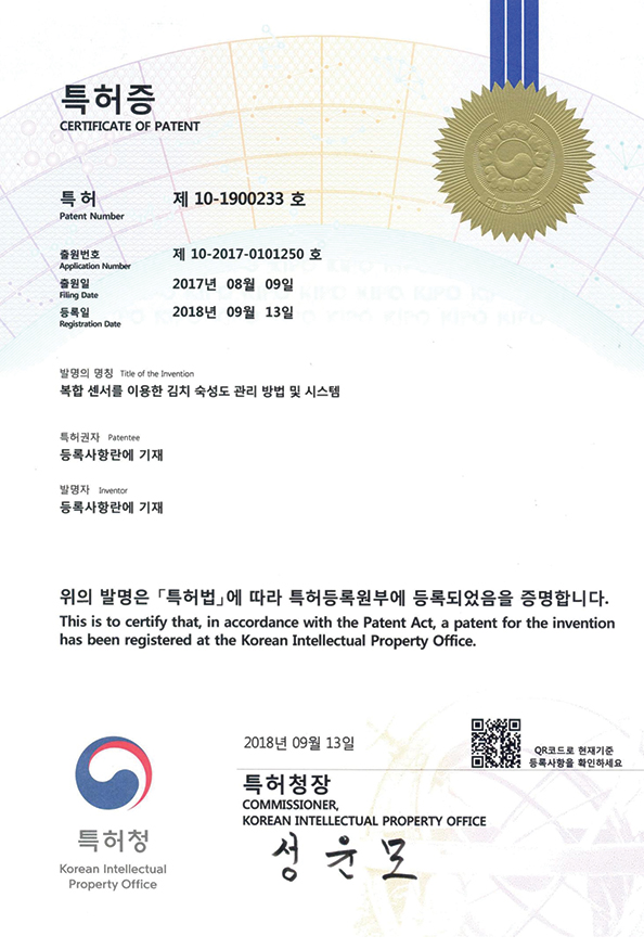 | 26 | 2018. 09. 13 | 10-1900233 | 복합 센서를 이용한 김치 숙성도 관리 방법 및 시스템 |